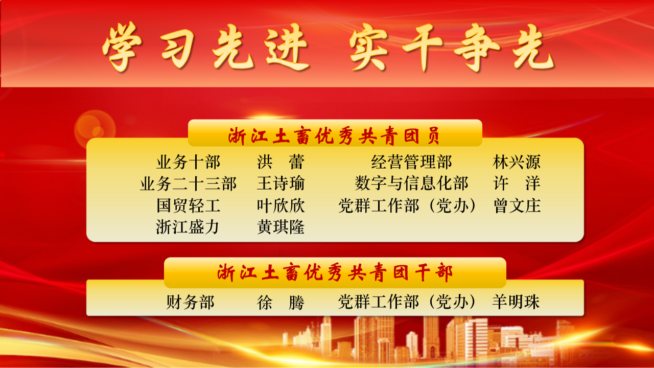 為表彰先進、樹立榜樣,激勵公司各級團組織和廣大團員青年比學趕超、奮勇爭先浙江土畜團委決定,對2024年度優秀共青團員、優秀共青團干部予以表彰。希望各級團組織和團員青年,要以受表彰的先進典型為榜樣,學習他們對黨忠誠、積極向上的政治本色,學習他們敢挑重擔、沖鋒在前的硬核擔當,學習他們立足一線創先爭優的務實作風,學習他們遵規守紀、積極作為的職業操守。要大力傳承和發揚土畜人“實干”的優良傳統,在深度融入共同富裕、開放強省等重大戰略中加快打造“國際供應鏈服務價值創造者”,貢獻更多青春力量。
