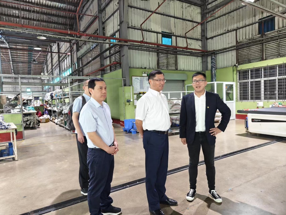 12月9日,中國紡織品進出口商會會長曹甲昌到公司惠元(緬甸)制衣工廠走訪調(diào)研,省商務廳外貿(mào)發(fā)展處副處長王舒立,緬甸工廠負責人等陪同調(diào)研。